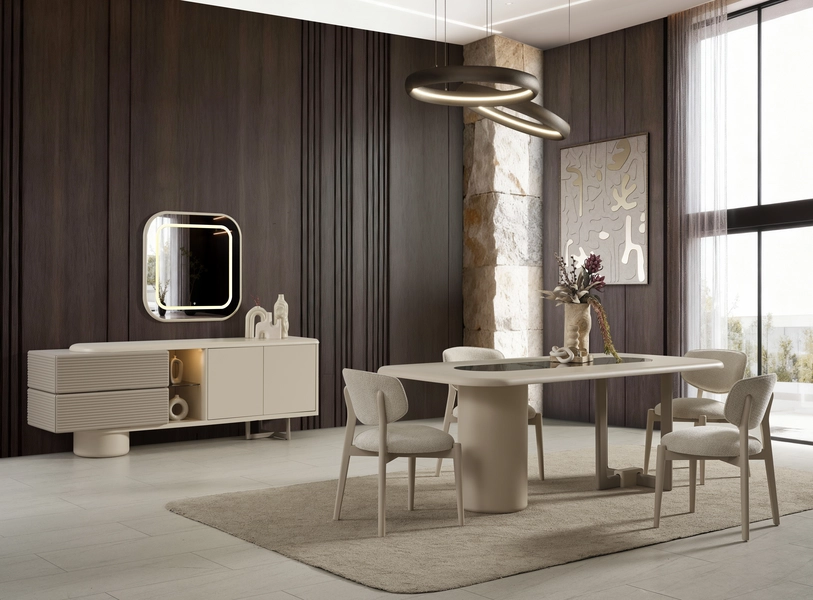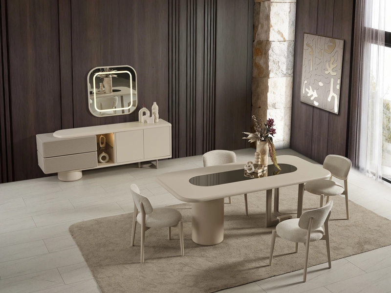 Takım içeriğinde 1 adet Almira Yemek Odası Masa, 1 adet Almira Yemek Odası Sandalye, 1 adet Almira Yemek Odası Konsol, 1 adet Almira Yemek Odası Konsol Aynası, 1 adet Almira Yemek Odası Orta Sehpa, 1 adet Almira Yemek Odası Yan Sehpa X2 bulunmaktadır.