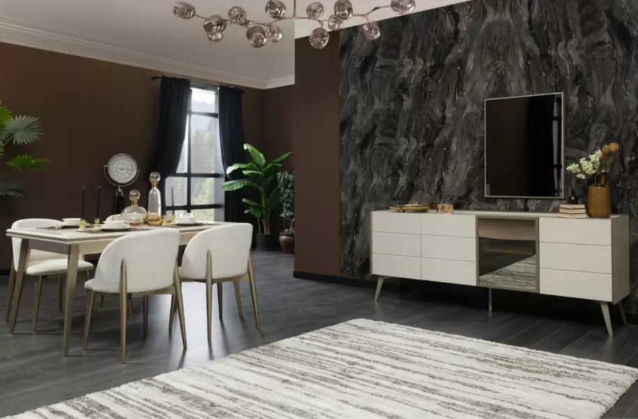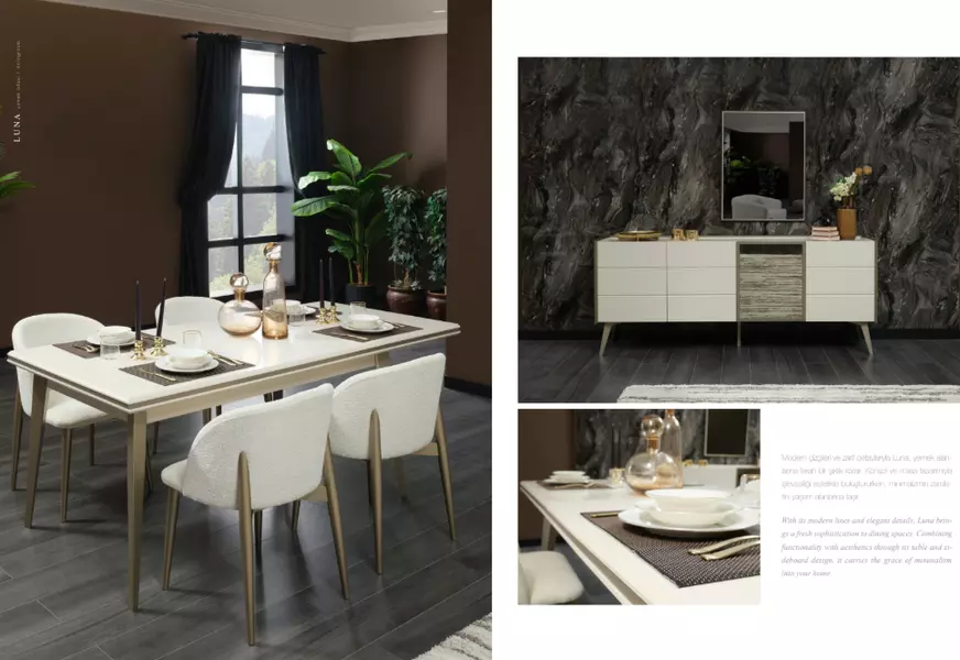 Takım içeriğinde 1 adet LUNA YEMEK ODASI Açılabilir Masa, 1 adet LUNA YEMEK ODASI Konsol, 1 adet LUNA YEMEK ODASI Konsol Aynası, 1 adet LUNA YEMEK ODASI Sandalye, 1 adet LUNA YEMEK ODASI Sehpa bulunmaktadır.